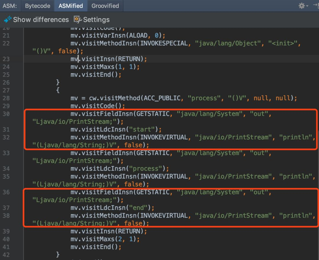 安装后,右键选择“Show Bytecode Outline”,在新标签页中选择“ASMified”这个tab,如图19所示,就可以看到这个类中的代码对应的ASM写法了。图中上下两个红框分别对应AOP中的前置逻辑于后置逻辑,将这两块直接复制到Visitor中的visitMethod()以及visitInsn()方法中,就可以了。