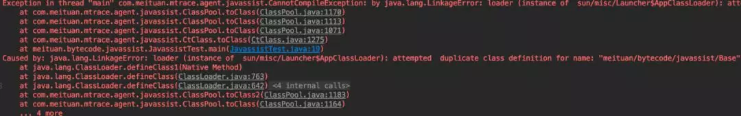 如果我们在一个JVM中,先加载了一个类,然后又对其进行字节码增强并重新加载会发生什么呢?模拟这种情况,只需要我们在上文中Javassist的Demo中main()方法的第一行添加Base b=new Base(),即在增强前就先让JVM加载Base类,然后在执行到c.toClass()方法时会抛出错误,如下图20所示。跟进c.toClass()方法中,我们会发现它是在最后调用了ClassLoader的Native方法defineClass()时报错。也就是说,JVM是不允许在运行时动态重载一个类的。