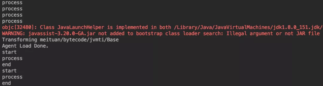 以下为运行时重新载入类的效果:先运行Base中的main()方法,启动一个JVM,可以在控制台看到每隔五秒输出一次"process"。接着执行Attacher中的main()方法,并将上一个JVM的pid传入。此时回到上一个main()方法的控制台,可以看到现在每隔五秒输出"process"前后会分别输出"start"和"end",也就是说完成了运行时的字节码增强,并重新载入了这个类。