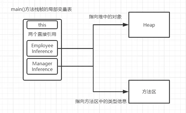 要使用EmployeeDemo的main()方法,那首先要把Employee, Manager, EmployeeDemo这三个类对应的.class文件加载到方法区中,并形成相应的运行时数据结构,加载是通过类加载器进行的;最后会生成.class对象作为访问类的类型数据的外部接口;