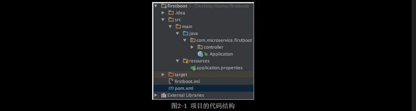 在IDEA中创建了一个Maven项目,项目名为firstboot,项目的代码结构如图2-1所示。