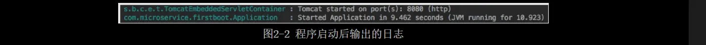 程序启动成功后,就会在控制台输出如图2-2所示的两行日志,从第一行可以看出Tomcat的启动port,第二行是Spring Boot启动成功的标志。这里还给出了项目启动所花费的时间。