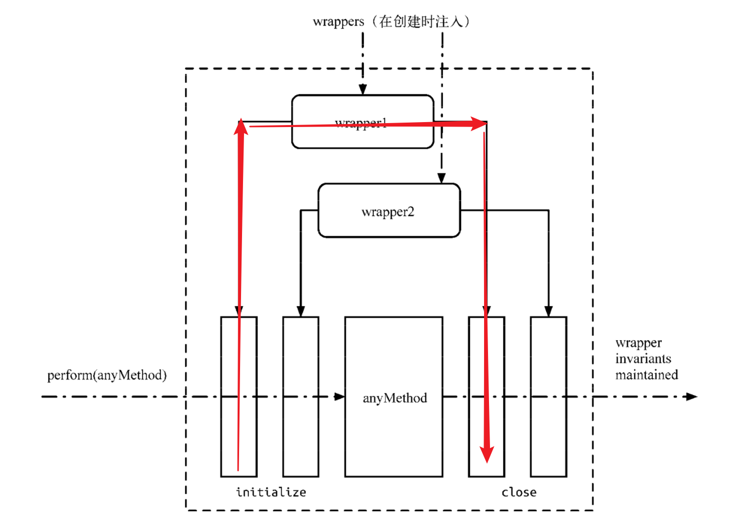 简单地说,一个 Transaction 就是将需要执行的 anyMethod 使用 wrapper 封装起来,在通过 Transaction 提供的 perform 方法执行,而在 perform 之前,先执行所有 wrapper 中的 initialize 方法,perform 之后再执行所有 wrapper 中的 close 方法。一组 initialize 及 close 方法称为一个 wrapper,Transaction 支持多个 wrapper 叠加。