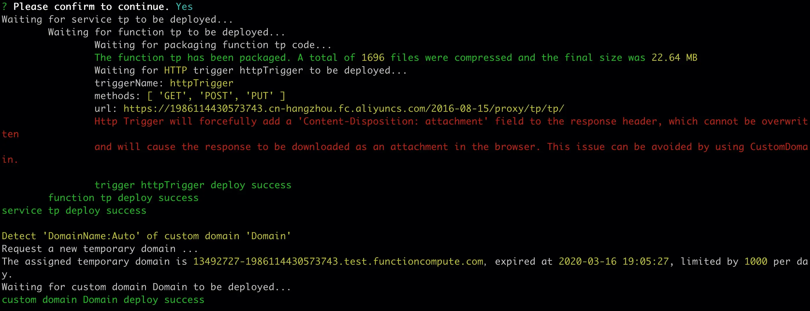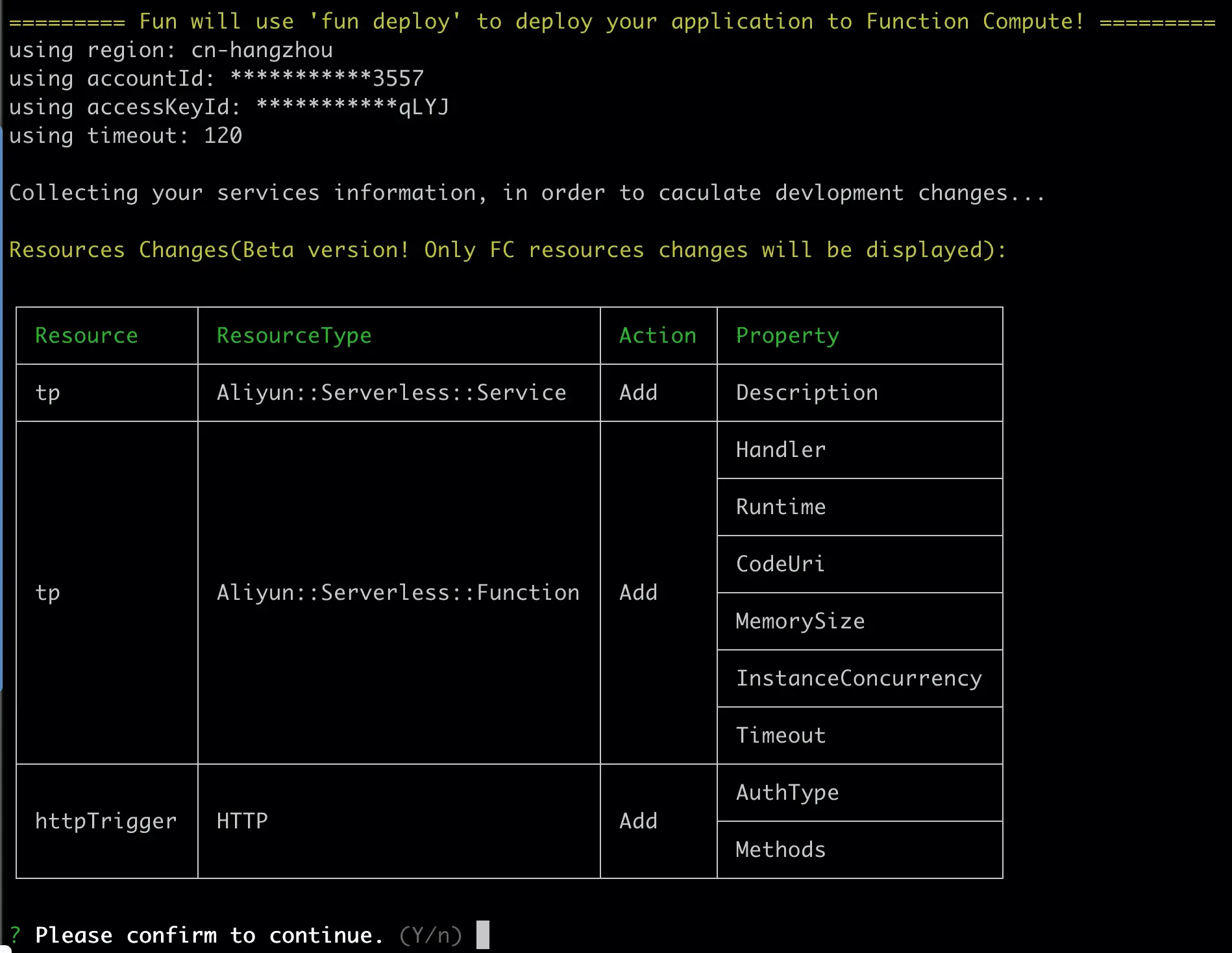 - Fun 项目自动创建成功,提示是否进行部署?可以直接回车,或者输入 y 进行确认