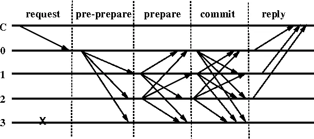 Prepare:每个节点接收到交易列表后,根据排序模拟执行这些交易。所有交易执行完后,基于交易结果计算新区块的哈希摘要,并向全网广播,1->023,2->013,3因为宕机无法广播