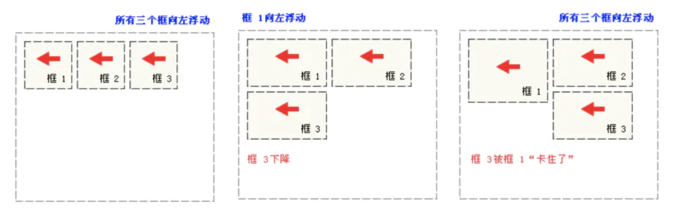 浮动元素会脱离文档流,并向左/右浮动,直到碰到父元素或者另一个浮动元素的边框