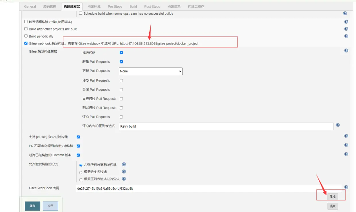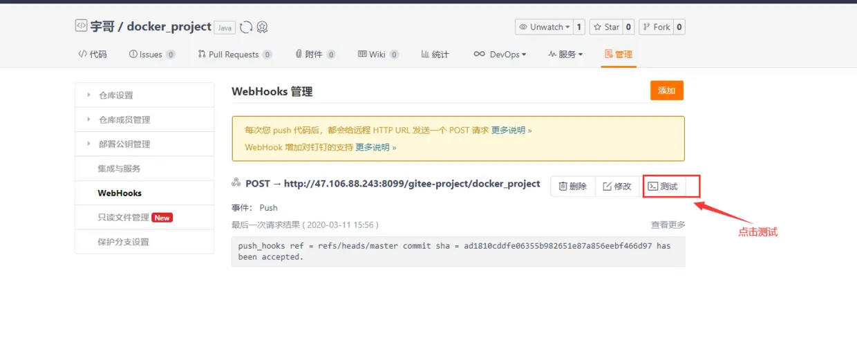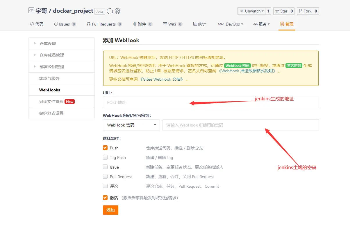 到这一步我们去配置Gitee,将生成的Hook 地址和密码丢给gitee上