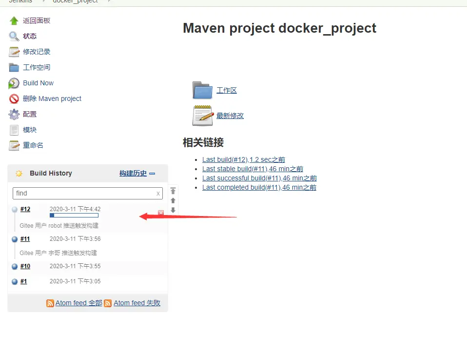 查看jenkins构建记录(Gitee上项目提交代码,这里都会增加一次构建记录,蓝色表示成功)