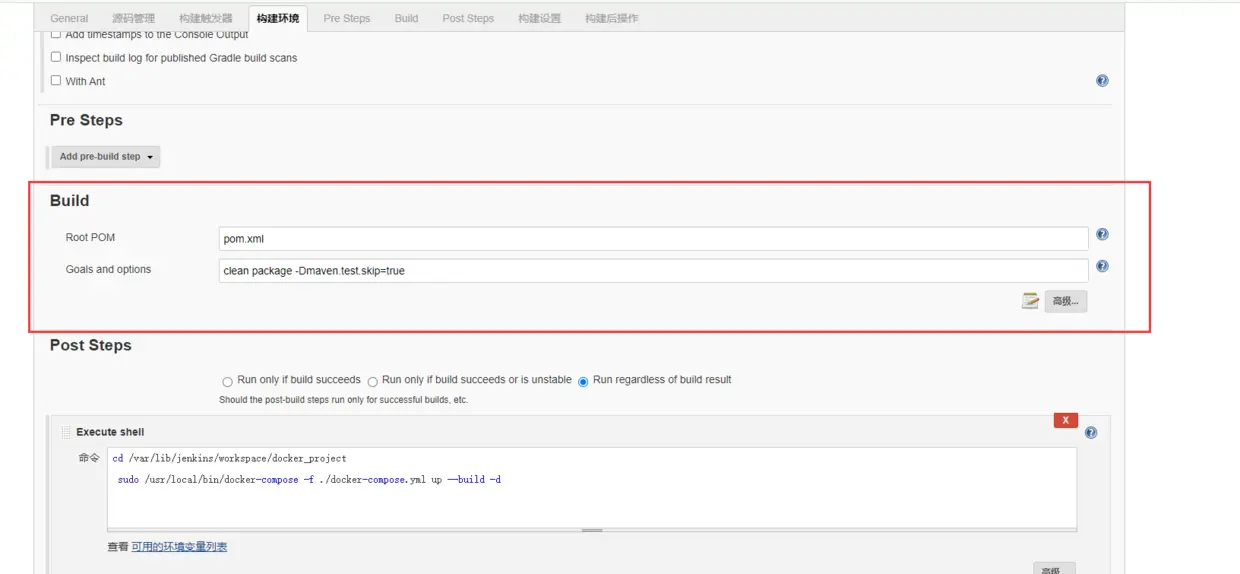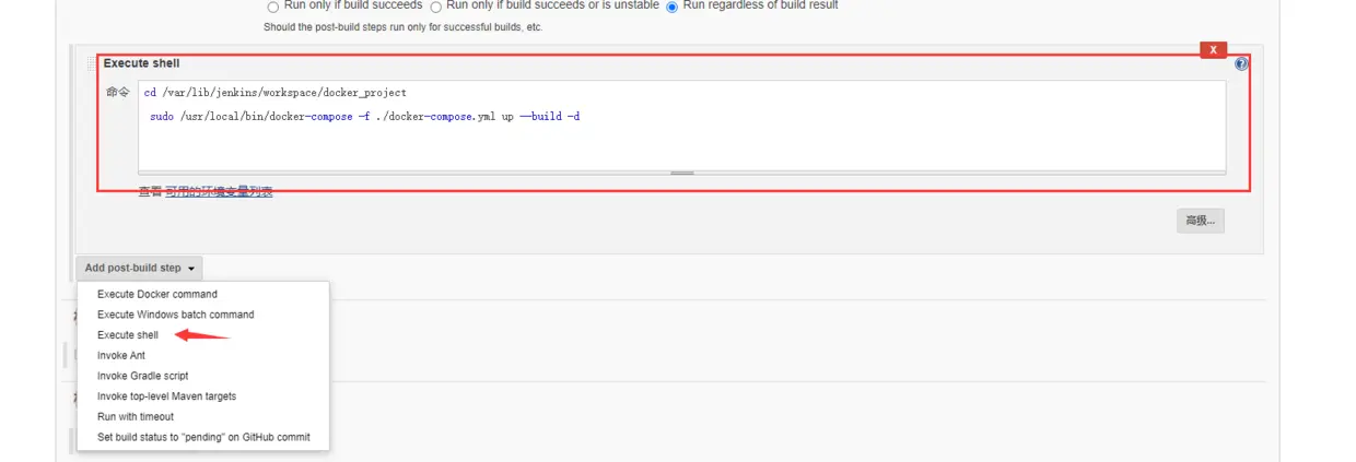 cd /var/lib/jenkins/workspace/docker_project sudo /usr/local/bin/docker-compose -f ./docker-compose.yml up --build -d 不要直接使用sudo /docker-compose -f ./docker-compose.yml up --build -d 会报以下错误 sudo: docker-compose: command not found