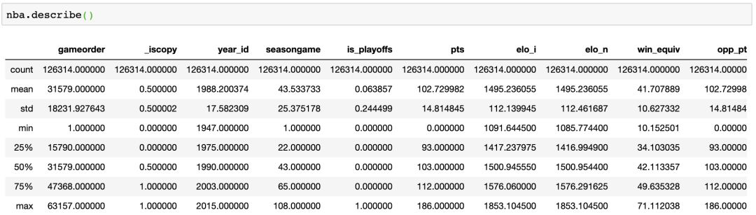 那么我们继续使用之前文章中使用过很多次的NBA数据集,还记得我们在介绍pandas使用的那篇文章中分很多章节去讲解如何使用pandas对该数据集进行一些基础的数据分析吗(python数据分析万字干货!一个数据集全方位解读pandas)。那就是使用df.describe()函数