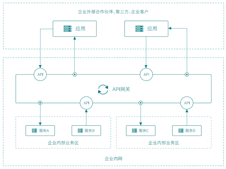 API 网关进行服务能力的共享,API 网关为用户提供发布、管理、保护和监控 API的能力,帮助用户在自己的多个系统之间,或者内部系统与合作伙伴以及第三方的系统之间实现跨系统、跨协议的服务能力互通。API网关应用场景