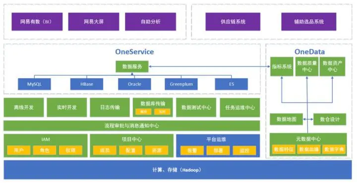 全链路大数据产品网易猛犸6.0建立在Hadoop基础之上,包括16个子产品(上图中绿色模块标识部分),覆盖了数据生产、治理的完整链路,本着“简单易用,举重若轻”的产品设计思想,我们采取了“组件式”的产品设计模式,每个产品都聚焦一个典型的场景,业务可以根据自身的需要,选择性的搭配一些产品应用,解决业务当前面临的问题。同时猛犸6.0具备可扩展的产品架构,业务方可以基于该产品提供的基础能力,扩展新的产品。全链路大数据产品网易猛犸6.0在大数据开发、任务运维、数据集成等大数据平台的基础上,主要增加了两个板块,一个是OneData体系,它是以元数据中心作为基础的,在元数据中心之上提供了5个中台相关的产品:数仓设计中心、数据资产中心、数据质量中心、指标系统和数据地图。