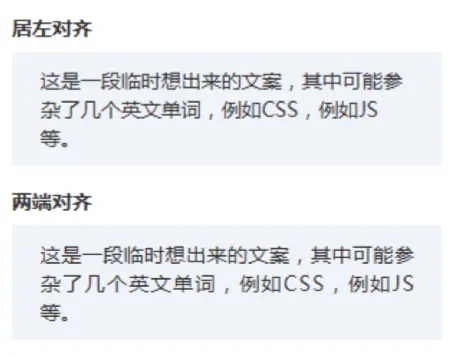 我们最长使用的就是left/center/right,这里不做介绍了,除此之外,还有justify属性值,用于文本的两端对齐效果。
