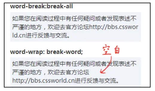 他们两的最大区别:word-break:break-all 的作用是所有的都换行,毫不留情,一点儿空 隙都不放过,而 word-wrap:break-word 则带有怜悯之心,如果这一行文字有可以换 行的点,如空格或 CJK(中文/日文/韩文)之类的,就不打英文单词或字符的主意了,在 这些换行点换行,至于对不对齐、好不好看则不关心,因此,很容易出现一片一片空白区 域的情况。