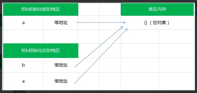 堆(heap):js 中引用类型的值实际存储在堆内存中,它在栈中只存储了一个固定长度的地址,这个地址指向堆内存中的值