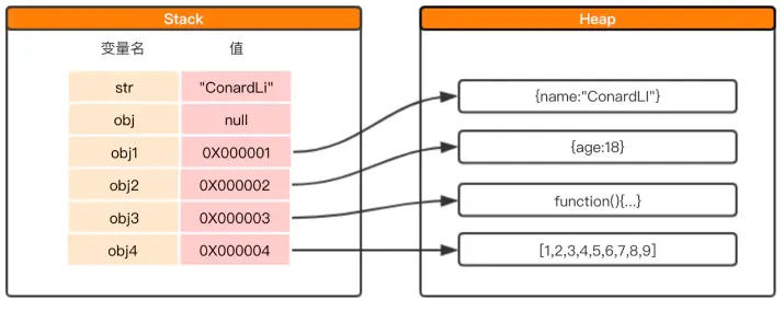 - 引用类型的值(object)是存放在堆内存中的,变量实际上是一个存放在栈内存的指针,该指针指向堆中该实体的起始地址。当解释器寻找引用值时,会首先检索其在栈中的地址,取得地址后从堆中获得实体