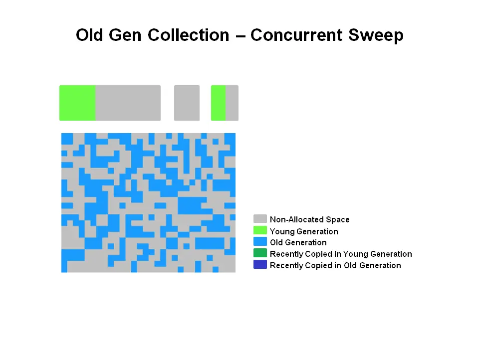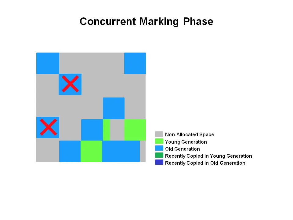 | (4)并发清除 | 回收标记阶段识别为不可达的对象。死对象的回收添加这个对象的空间到一个空闲列表,用于后续分配。此刻可能发生死对象合并。注意存活对象不会被移动。 |