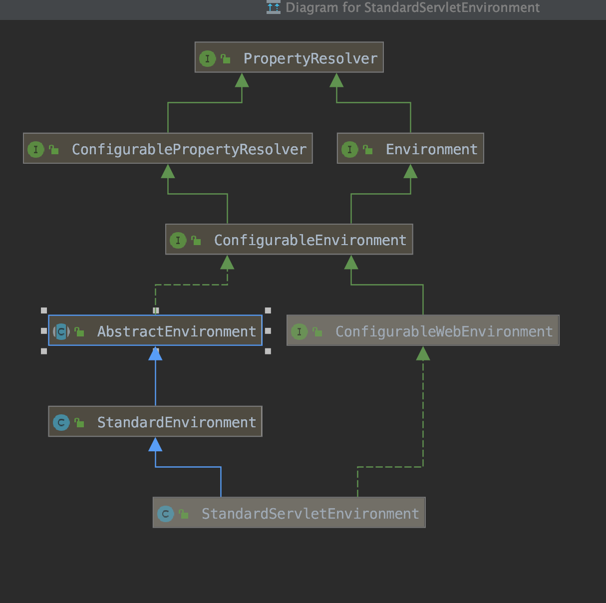 如下图所示,StandardServletEnvironment 的类关系图如下所示,