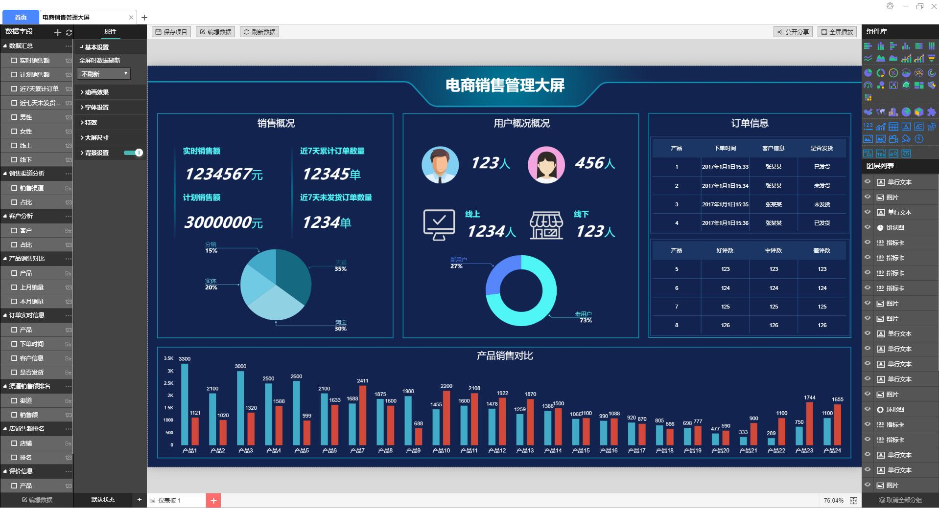 系统通过整合电商的订单、用户、流量、财务数据,进行收入、成本、客户等主题分析,展示指标变化,包括环比、同比、用户快照分析、沉睡率、唤醒率、平均回购周期等。直观的展现该电商平台经营各项指标,实时反映平台的运行状态,按主题、成体系的将庞大复杂的电商经营数据背后的联系呈现出来。