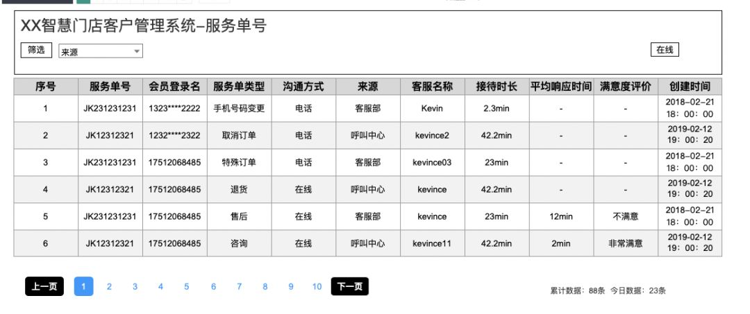 下图是我带团队搭建的智慧门店客服系统里的服务单号管理。在服务单号里面,通过角色和权限识别客服一线和管理者,判别用户基本信息。比如手机号可以做隐私处理,而管理者或特定客服部门可以查看用户手机号。