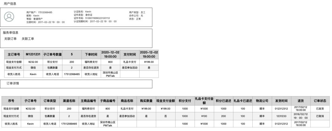 同时针对用户问题订单的购买时间、支付金额、优惠信息、购买产品是否参加活动等,进行展示。让客服人员定位用户的问题在哪里,出在什么地方。这类信息中后台产品要和客服部门甚至是财务、市场拉通沟通,确保客服系统的需求优先级明确。