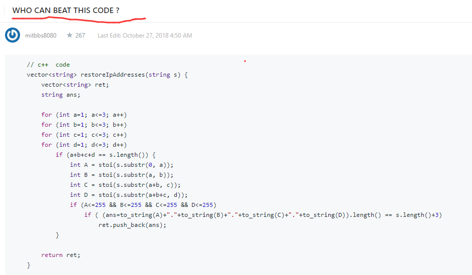 时间复杂度:如果不考虑我们调用的内部函数,Integer.parseInt,s.substring,那么就是 O(1)。因为每一层循环最多遍历 4 次。考虑的话每次调用的时间复杂度是 O(n),常数次调用,所以是 O(n)。