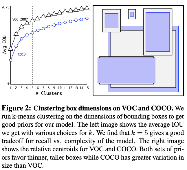 目前anchor是手工设定的,这可能不是最优的设定,使用k-means来对训练集的box进行聚类,获得更准确率的预设anchor。聚类使用IOU作为距离计算,具体为,从图2可以看出,5个簇时性价比最高,也是YOLOv2使用的设定