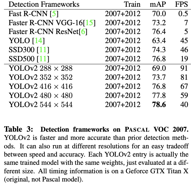由于YOLOv2为全卷积网络,可以任意修改输入的大小,在训练时,每10个batch任意切换一次输入分辨率,候选分辨率为32的倍数,如。在实际使用时,可以用不同的分辨率来满足不同的准确率和速度的要求,结果如表3