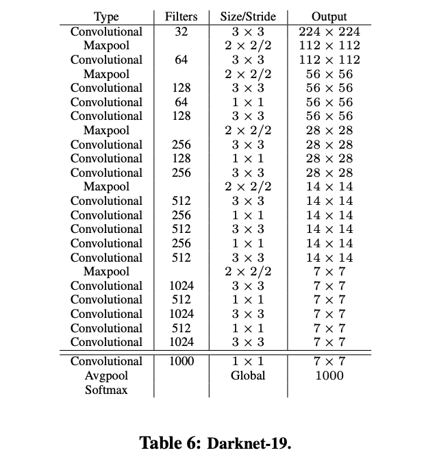 为了加速,YOLOv2使用了新的主干网络Darknet-19,包含19层卷积和5个池化层,使用卷积来对
