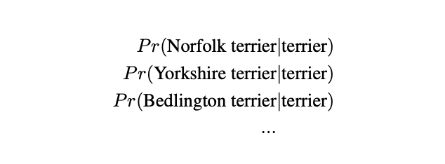 比如诺福克梗等猎犬都属于猎犬节点的下级分类,而诺福克梗的分类概率则为根节点到当前节点的路径上的所有节点概率的乘积