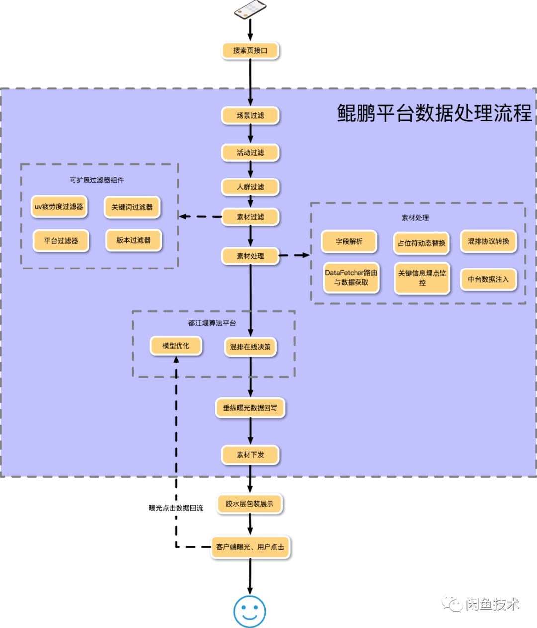 鲲鹏的一个重要目标是借助达摩院算法能力助力业务目标达成,实现全局流量分配调优。我们与达摩院共建了都江堰算法平台,实现了一套通用的混排算法,从工程侧打通离线数据通路与在线服务链路,各业务都可以低成本复用此算法能力。闲鱼首页feeds、闲鱼首页金刚卫上多条业务线投放已经使用了鲲鹏系统提供的通用混排算法能力,在保证业务方达成投放pv目标的基础之上,还把pvctr指标提升了60%~100%,且随着算法模型的不断迭代优化,效果指标还有很大的上升空间。