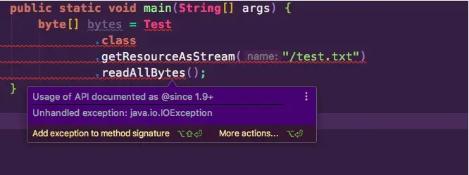 从classpath中读取过文件的人,都知道需要写一些读取流的方法,很是繁琐。最近使用IDEA在打出.这个符号的时候,一行代码让人激动不已:竟然提供直接读出bytes字节的方法。