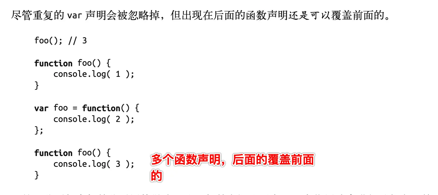 - 5、重复的 var 声明会被忽略掉,但出现在后面的函数声明还是可以覆盖前面的。