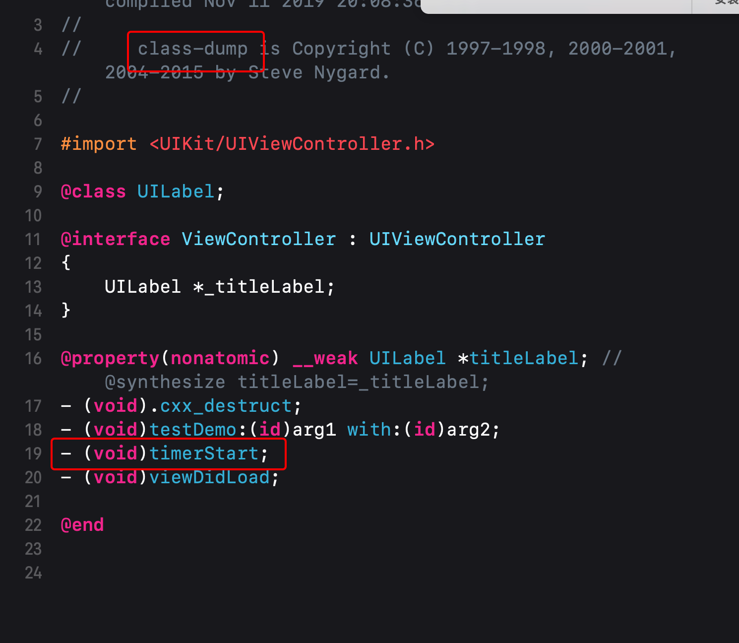 触目惊心,dump把我们的私有函数和变量都读出来了,- (void)timerStart;一眼就看出这个函数是做什么的了。