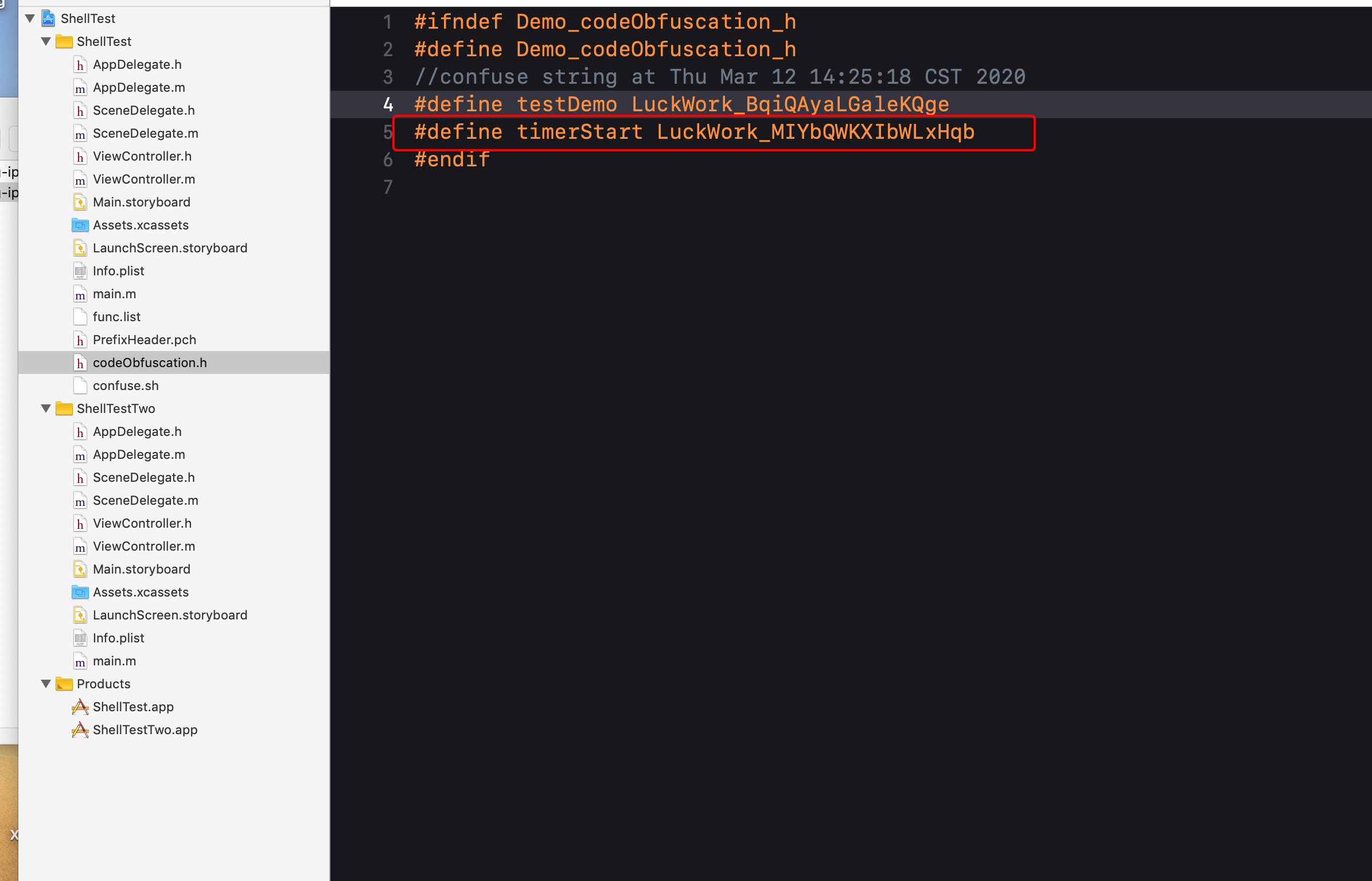 5.重新编译一下,工程目录下会创建一个新文件codeObfuscation.h,我们把他加到工程里,看看里面是什么