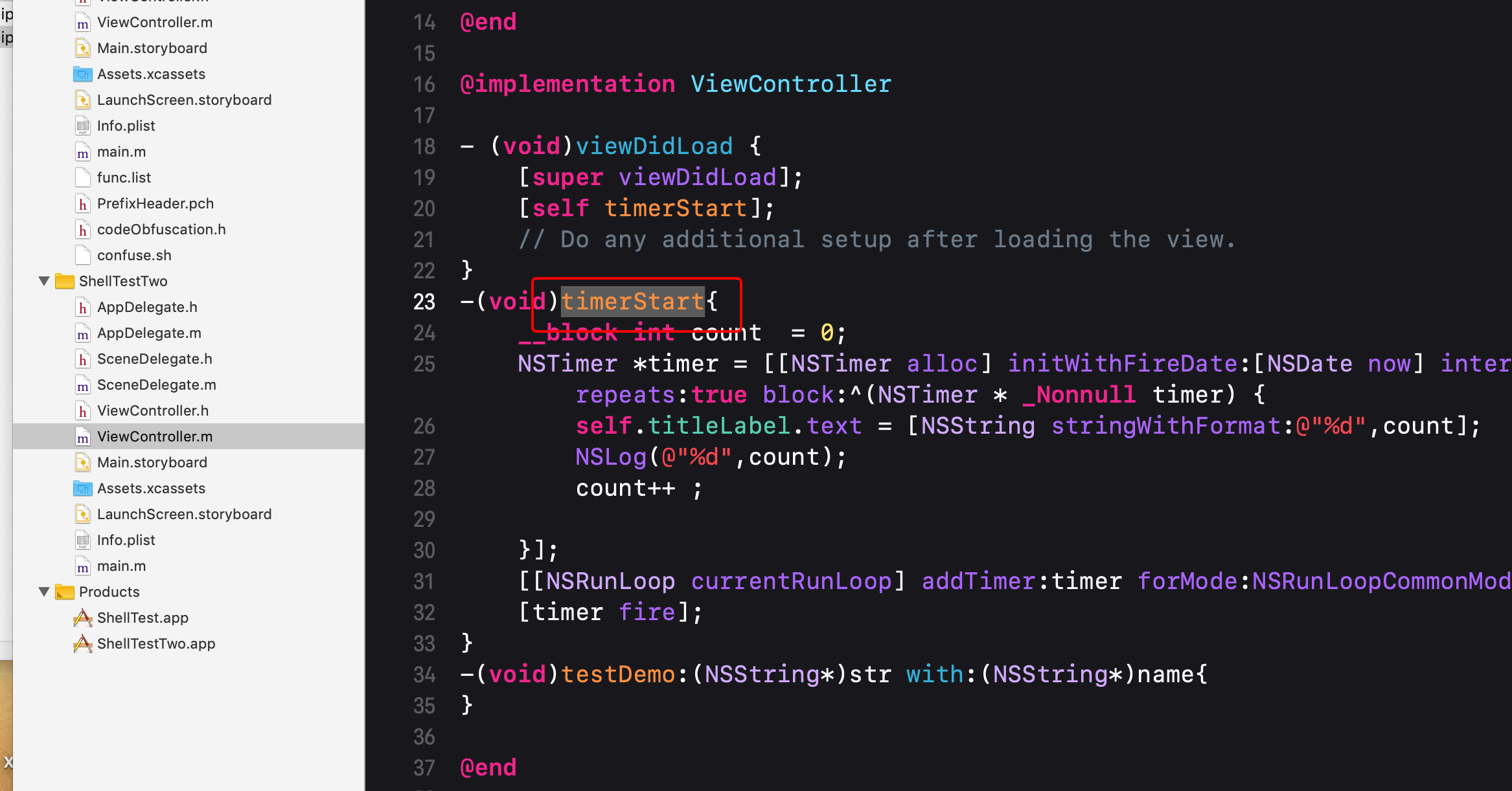 6.再回到工程的ViewController里面看看我们的timerStart函数,这个时候的timerStart已经指向刚刚生产的宏定义了