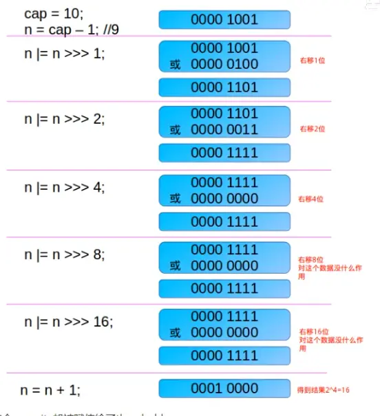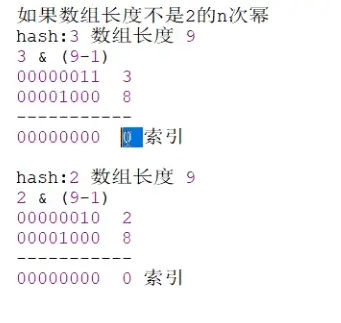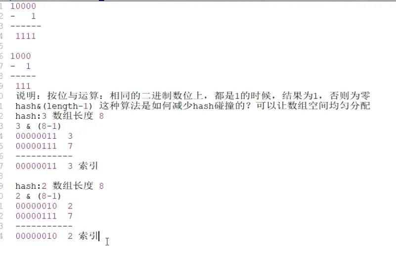 大小为2的幂是,在计算buckets桶位置的时候,公式为((n-1) & hash),2的幂减去1的数的二进制数的结尾都是1,与hash值进行与运算,会得到其余数。进行按位与操作,使得结果剩下的值为对象的hash值的末尾几位,这样就我们只要保证对象的hash值生成足够散列即可