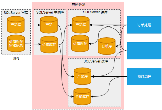 改造前,系统架构基于.NET平台开发,使用SQLServser数据库。随着时间和业务逻辑的积累,系统中存在大量陈旧的代码逻辑,数据库中也有很多废弃的表和字段,使用SQLServer的复制分发功能实现读写分离,不同系统之间依赖数据同步,这些陈旧的架构导致系统扩展性差,数据实时性低。