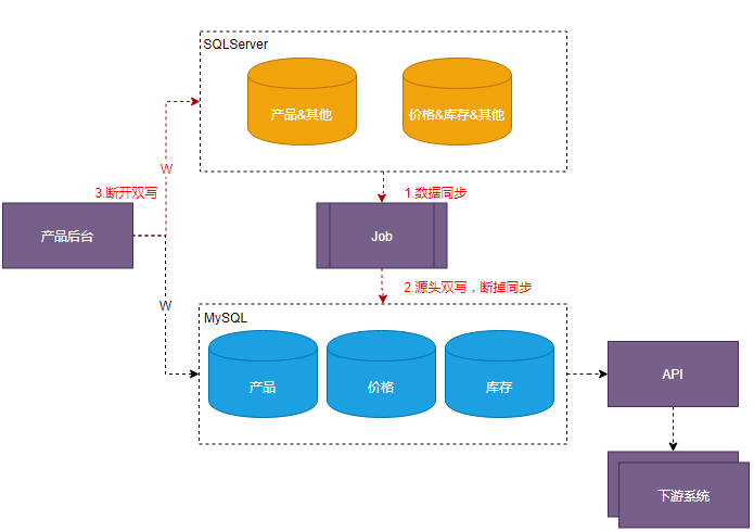 这个步骤是逐步对原来功能模块写数据的场景进行改造,在新老DB共存上下游逐步切换的场景中,保证业务的稳定性。在写原SQLServser数据的同时,将数据再对MySQL数据库写一份,以便于下一个阶段彻底解除对SQLServser数据的依赖。