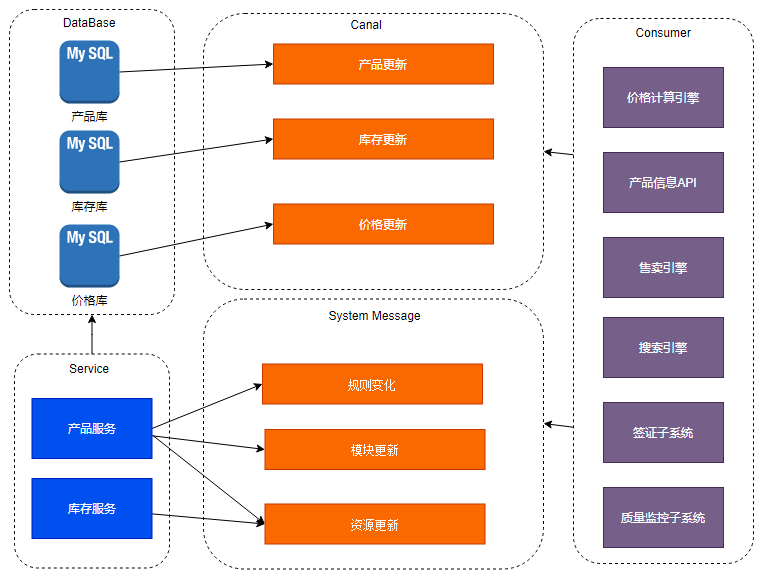 这两类消息结合,Canal消息的使用已经满足了大部分的功能场景,但是缺点是消息的数量是基于数据变化的,产品信息的一次变化可能更新几十张表,成百上千条数据。而系统消息也不是每个功能都需要发送,在特定关键信息发生变化的时候发送对应的信息给下游系统消费来弥补Canal消息量太大产生的问题。