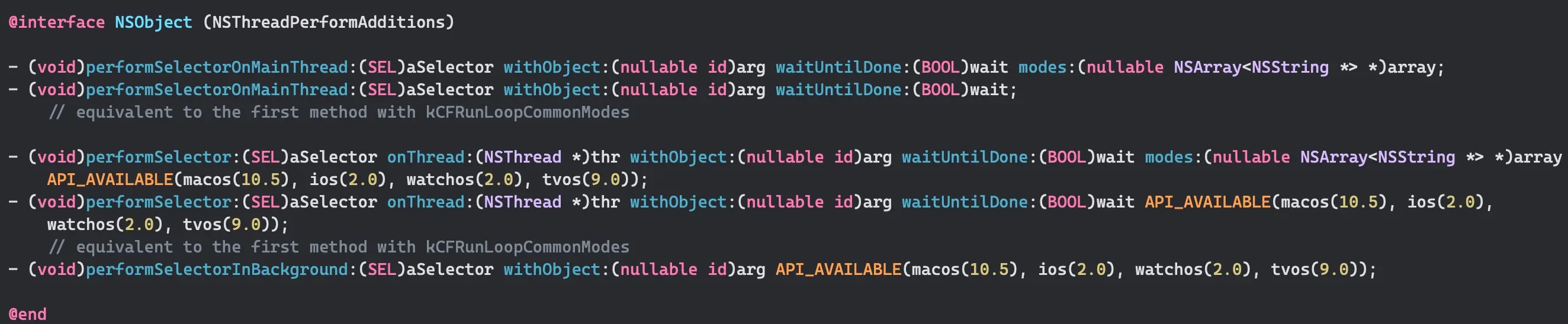不难看出,这里其实就是调用的 performSelector:onThread:withObject:waitUntilDone:modes 方法,但是有一个细节需要注意,就是有可能在 NSThread 类被初始化之前,就调用了 performSelectorOnMainThread 方法,所以需要手动调用一下 [NSThread currentThread]。