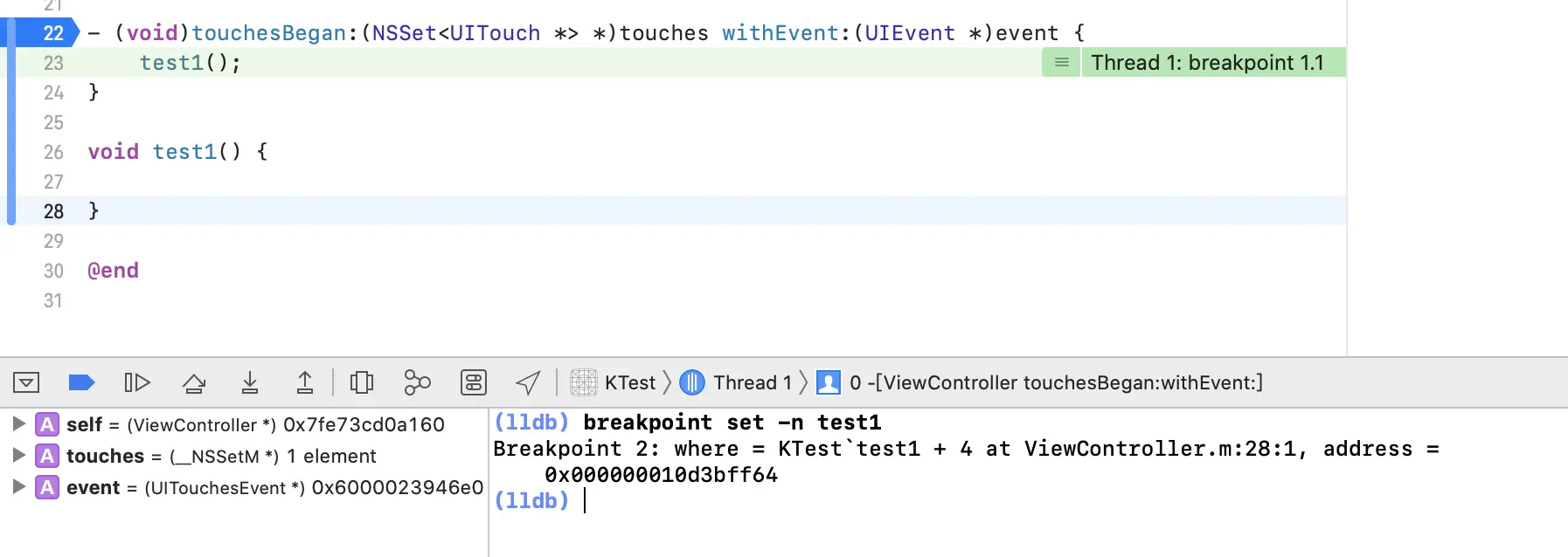 Breakpoint 2: where = KTest`test1 + 4 at ViewController.m:28:1, address = 0x0000000104abef64