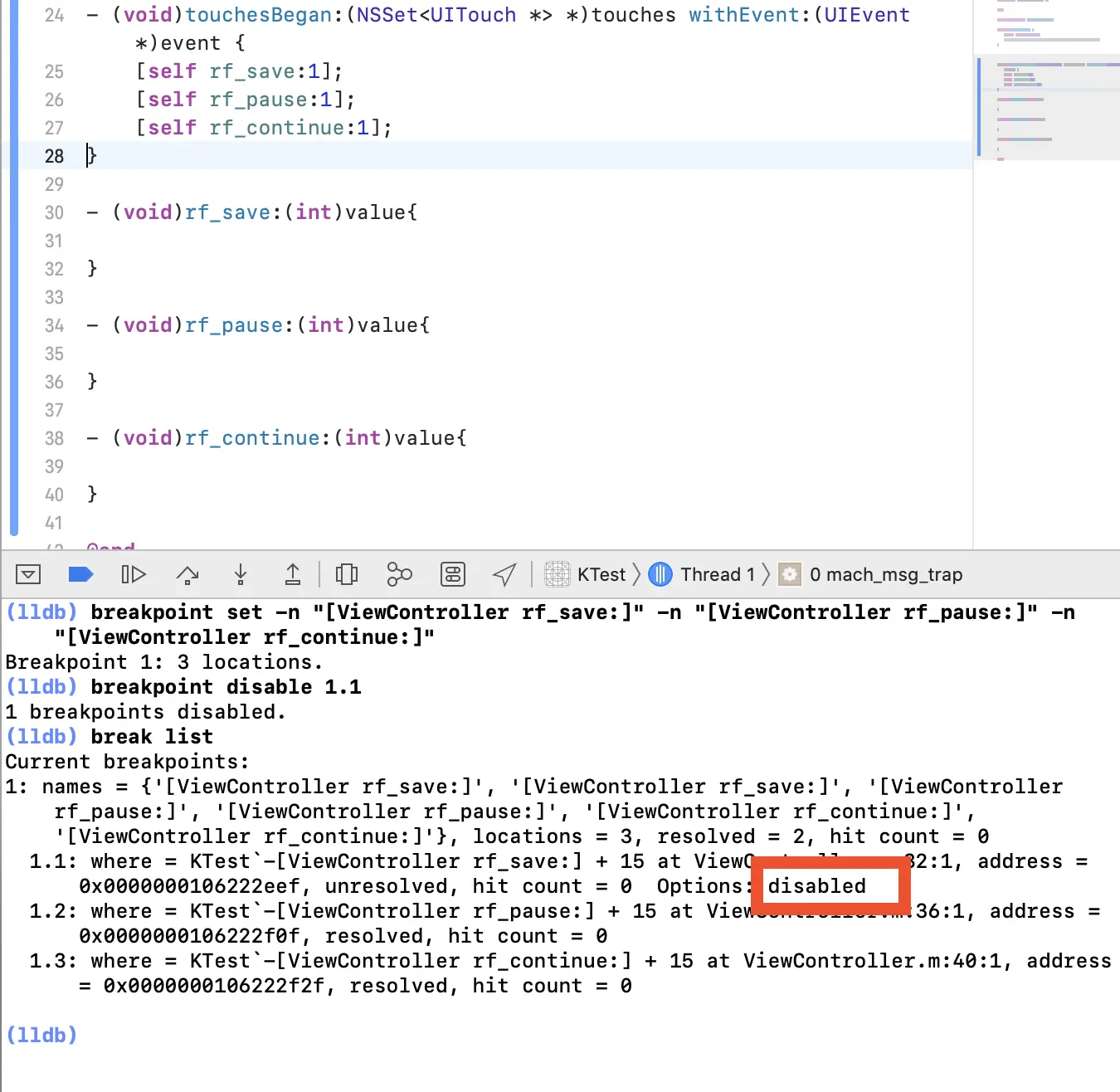 2.1: where = KTest`-[ViewController rf_save:] + 15 at ViewController.m:30:1, address = 0x0000000106d5aeef, resolved, hit count = 0