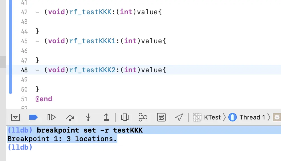 Breakpoint 2: where = KTest`-[ViewController rf_test:] at ViewController.m:55, address = 0x0000000108b47b00