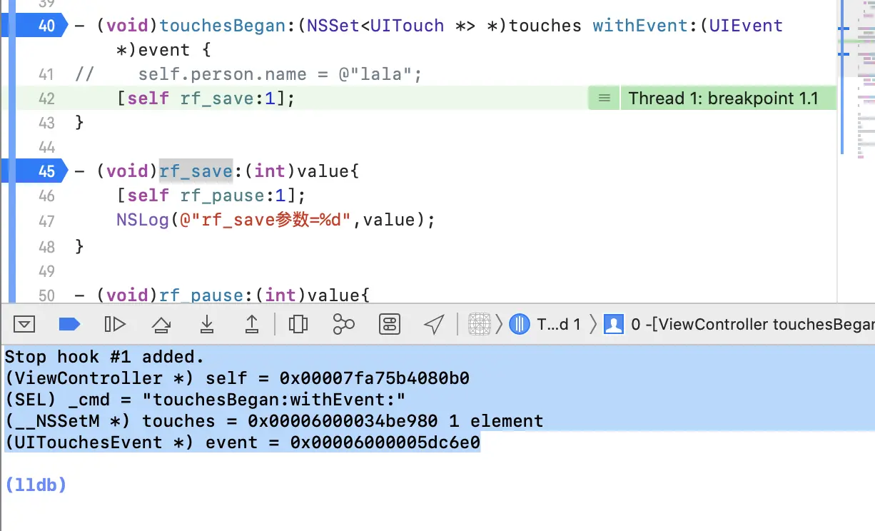 (lldb) breakpoint set -n "[ViewController rf_save:]" -n "[ViewController rf_pause:]" -n "[ViewController rf_continue:]"