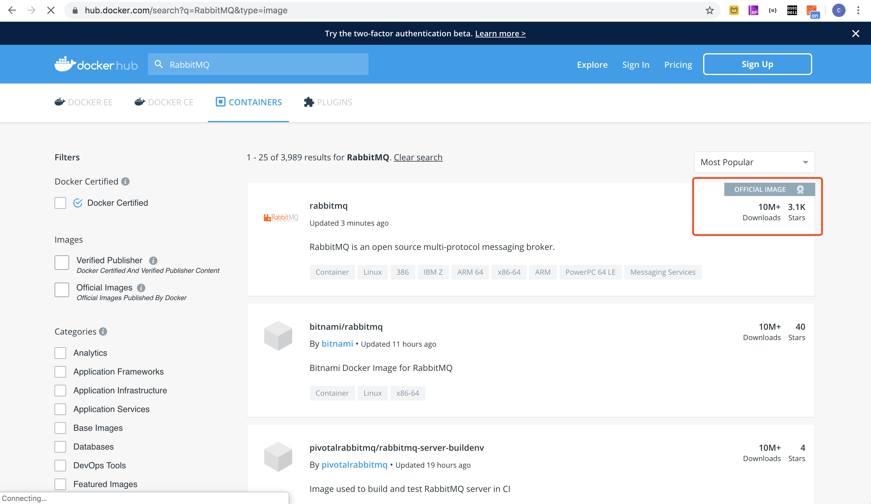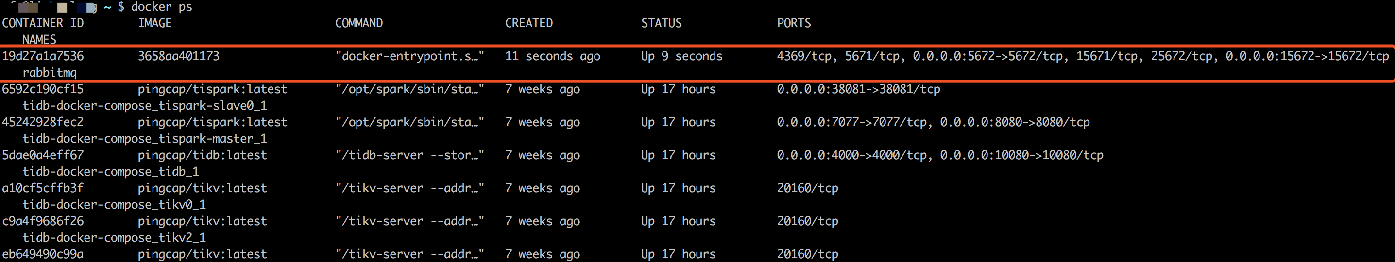 执行命令,查看正在运行的容器,可以观察到RabbitMQ已正常运行