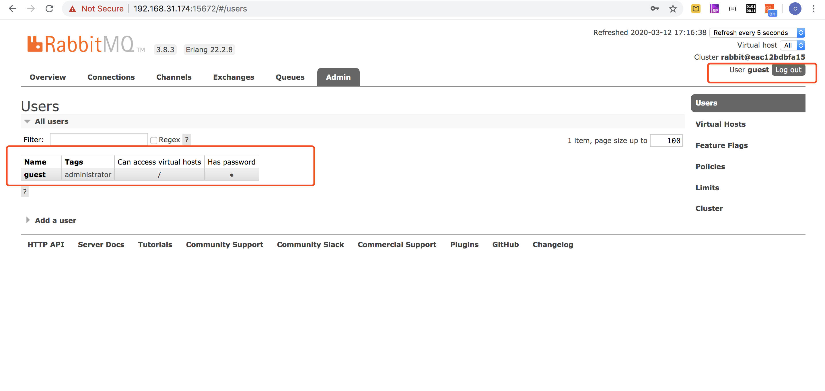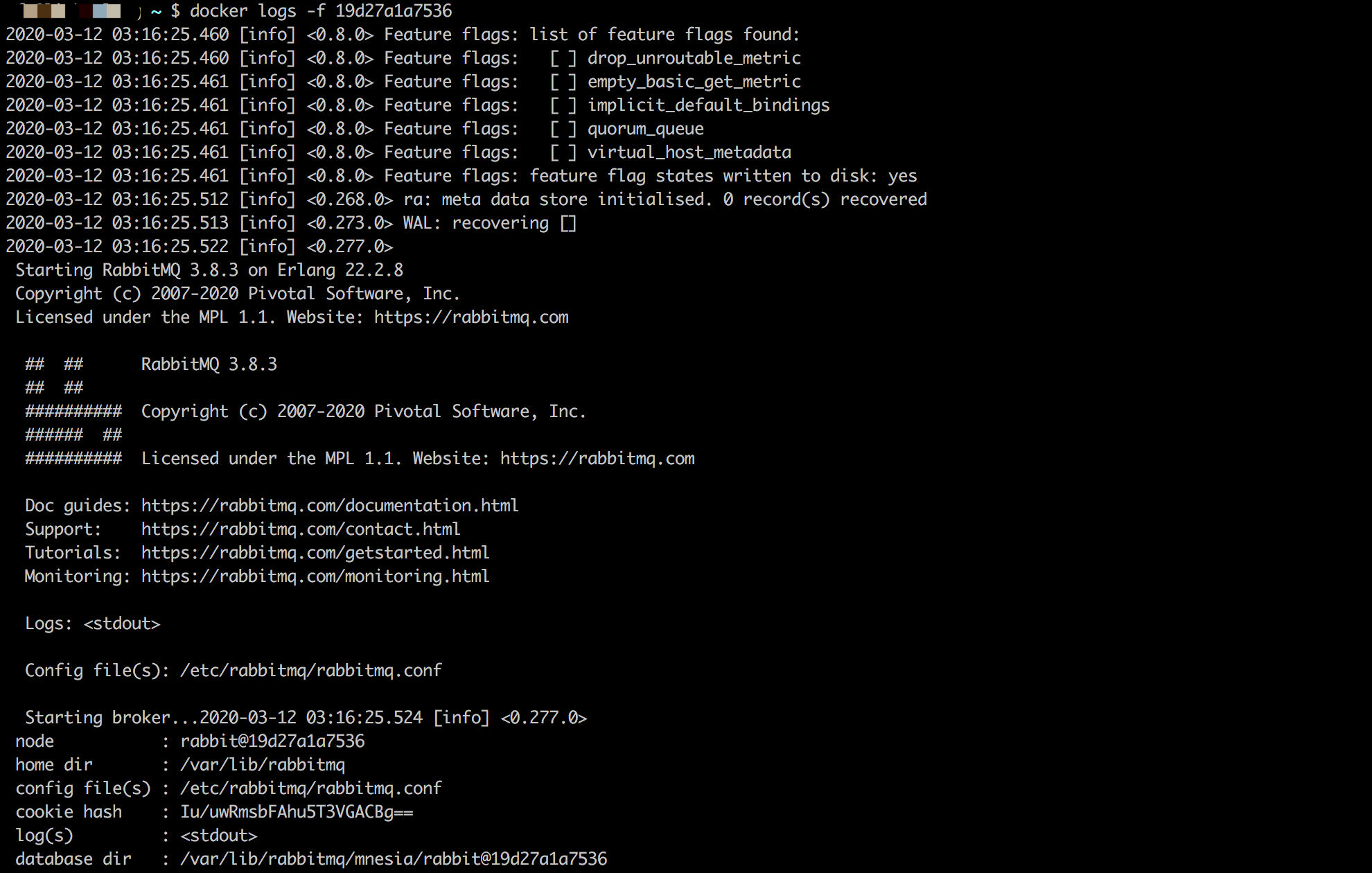 通过容器ID查看RabbitMQ的详细启动日志,从日志中可以观察到,RabbitMQ默认创建了guest用户,并且授予了administrator角色权限,同时服务监听5672端口TCP连接和15672端口的HTTP连接