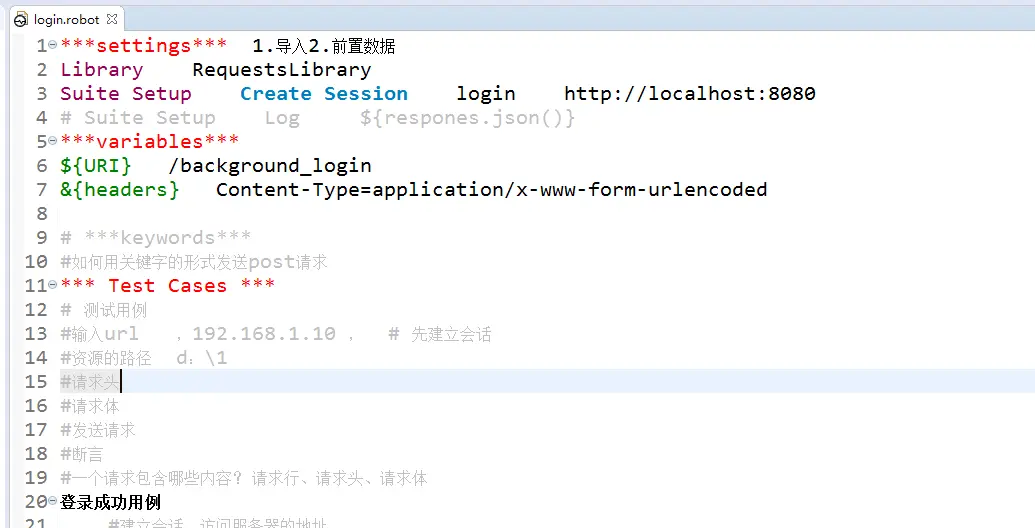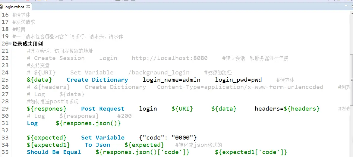 不管是Python语言 还是jmeter和postman工具发送请求都是统一把数据准备好后发送请求或Run运行,而RF需要先找到服务器或者域名的地址(先建立会话),然后发送请求,具体如下(一个登陆的接口请求):