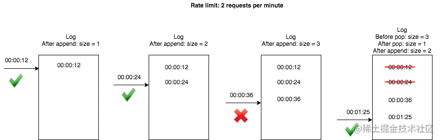 - 一个请求到来时,首先弹出所有超时的时间戳,然后再将当前请求时间加入Log