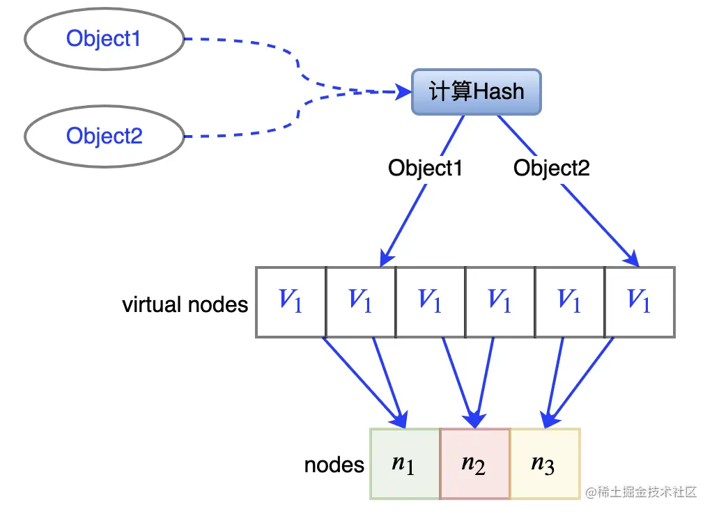 引入虚拟节点后,映射关系从【对象 服务器节点】,变为了【对象 虚拟节点 服务器节点】。